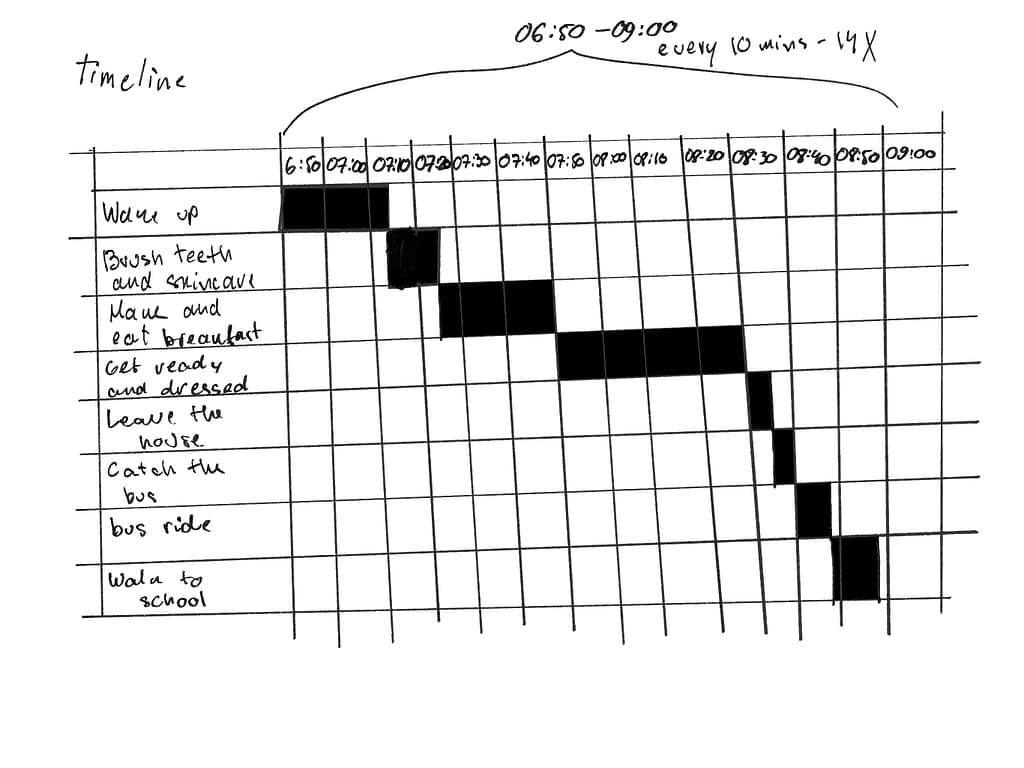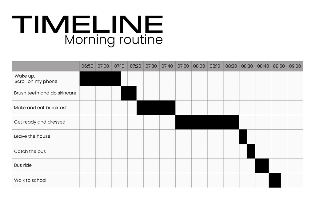 When I wake up, l usually spend a little bit of time scrolling through my phone to wake up my mind. After that, I get up, make my bed, brush my teeth, and do my skincare. Then I make breakfast and eat it quickly. After breakfast, I start getting ready and dressed. Before leaving, I check if I have everything I need in my bag for school. Finally, I leave the house and go to school.