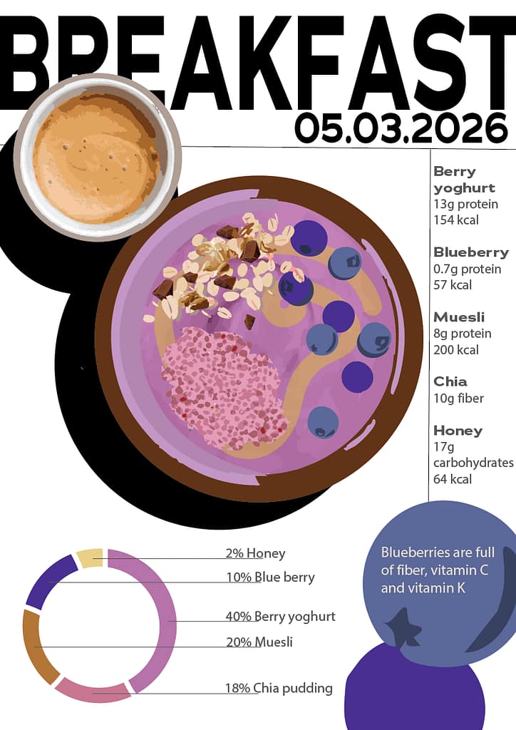 - Muesli: 456 kcal * 18g vet * 14g suiker * 10g eiwit * 0,15g zout