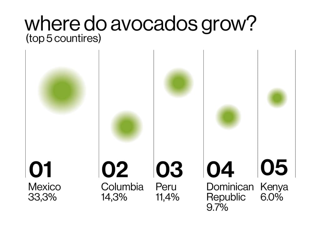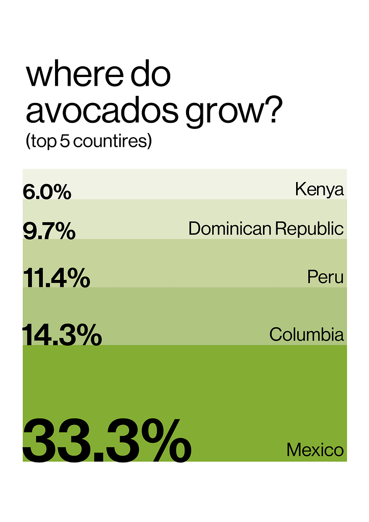 One part of my breakfast routine last week was avocado. I bought it at the market and started wondering where it might come from. For this infographic, I wanted to look into the production of avocados and find out where they mostly grow.