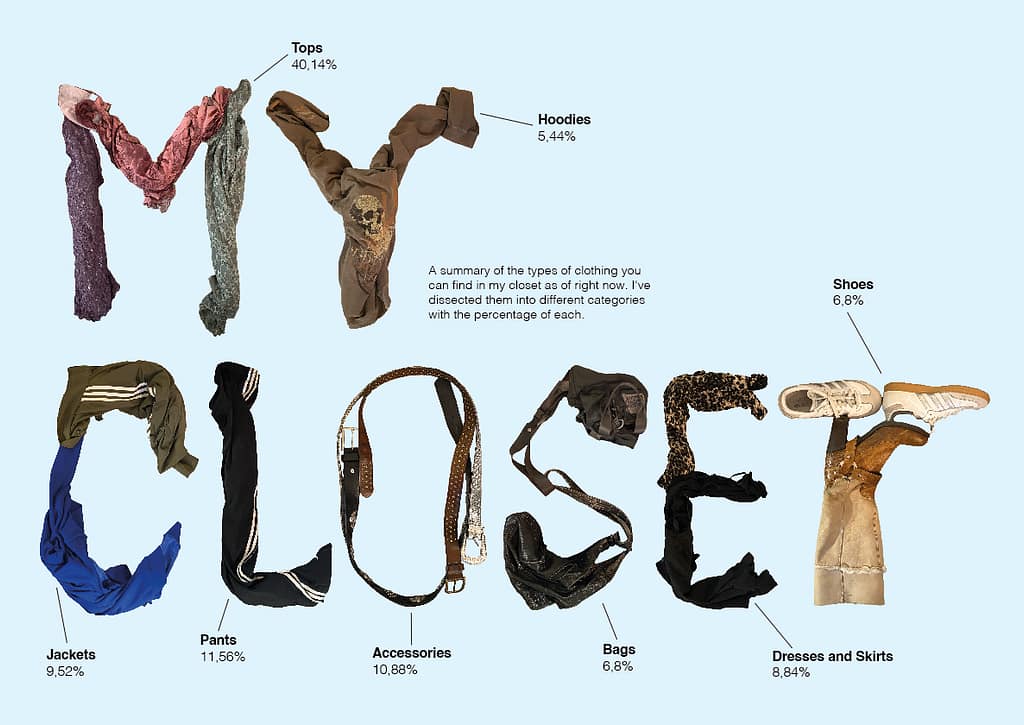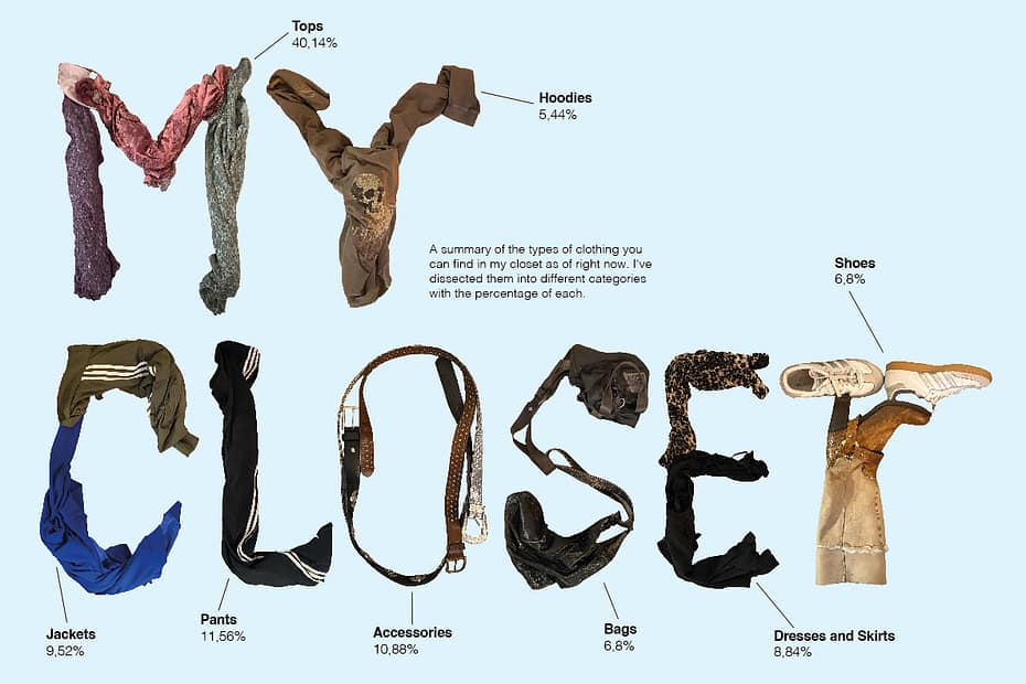 One part of my morning routine is getting dressed and picking out my outfit for the day. Therefore, I decided to take a closer look into my closet and started analyzing what and how many clothes I actually have in there. I dissected my clothes into 8 different categories and started counting how many pieces I have in each category, which I then later turned into percentages.