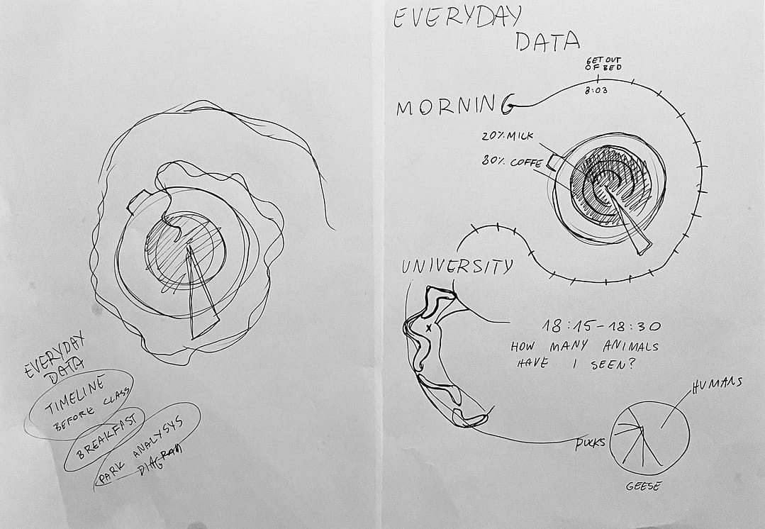 The original size of the file is as wide as a normal A4 and as tall as 2 A4 stuck on top of each other in vertical position. Every element of this flyer is hand drawn except of typography. When I started the background I went on google maps and found area that I am interested in and I took a screenshot. Later in procreate on the tablet I drew my version of the map over it. I wanted to have control over each puddle and each road. I decided to visualize the timeline as my road from home to school. It is not my exact home location, because I am not putting that information on the internet. For breakfast I had coffee. I chose this perspective of a cup, because the roundness of it reminded me of a diagram. The idea to make milk as a swirl was from when I was stirring the coffee. On the bottom of the flyer I put data that I have collected along with a diagram. I went to the park with my dog and for 15 minutes counted how many animals I saw. I included an X on the map as a spot for my observations. I thought it would be nice for a person reading it to have to go back up and see the flyer again to understand it. The results are on the design. I dropped shadow for the important typography, the coffee cup and diagram, to make it look more interesting and to make those objects appear to either be standing or floating on the map below them.
