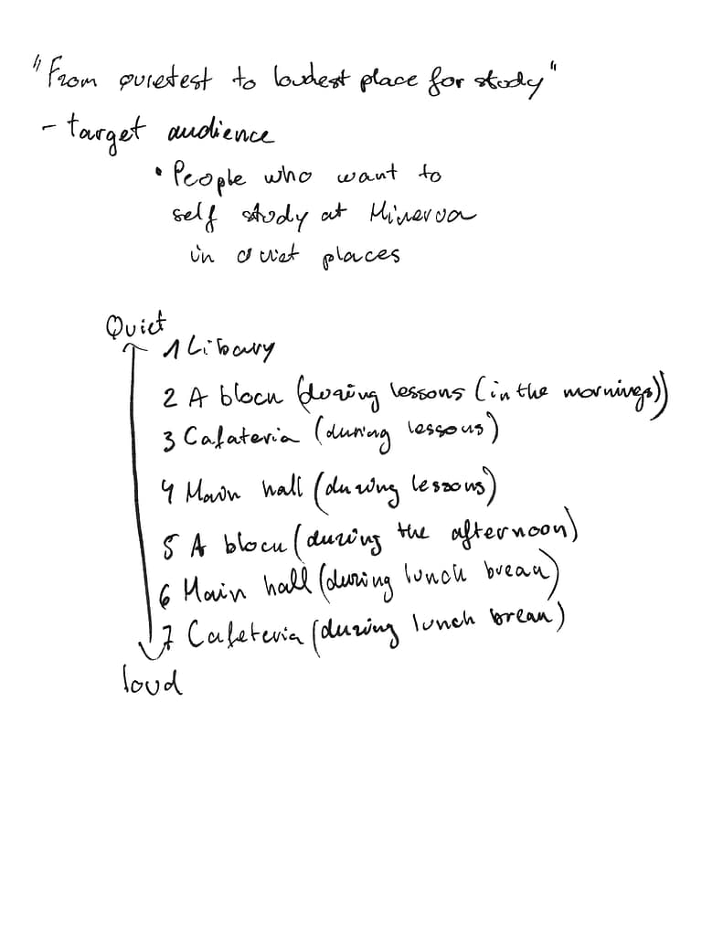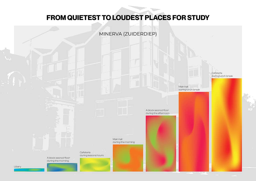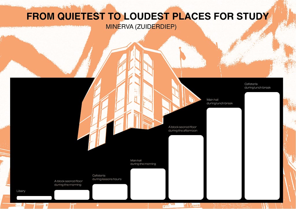 I decided to focus on study places around Minerva (Zuiderdiep) where I have seen many students studying outside of lessons. I visited different places and compared how quiet or loud they were, and then ranked them. I chose this topic because it can help other students find a place that suits their study needs, especially if they prefer a quiet environment. I found it interesting to notice how each place has a different noise level and atmosphere.