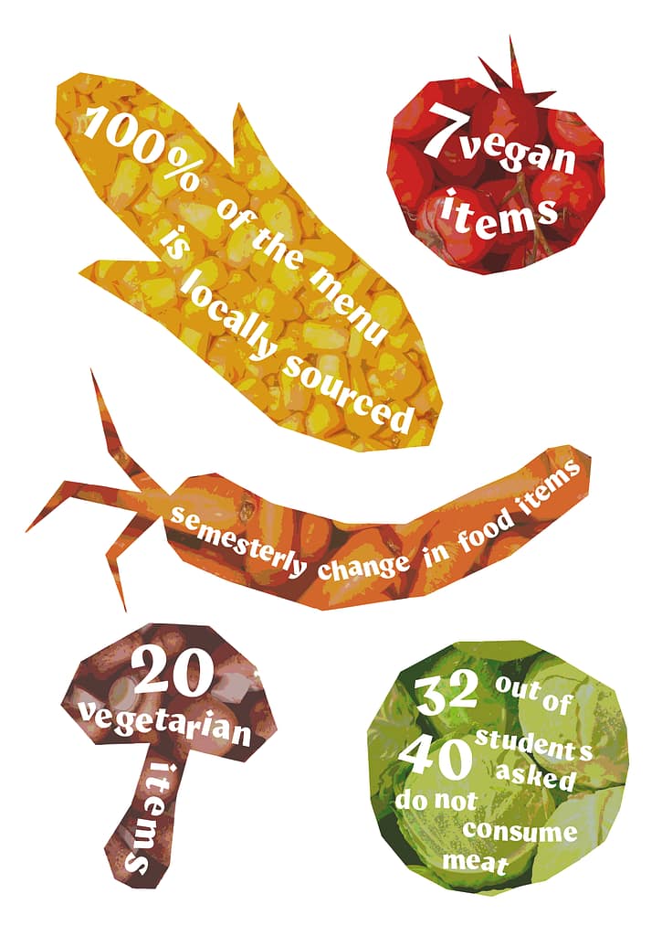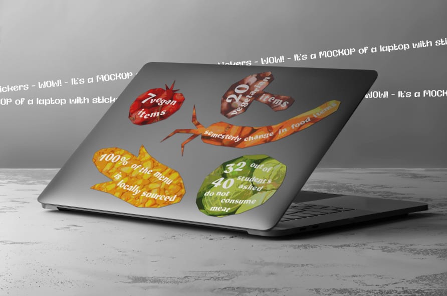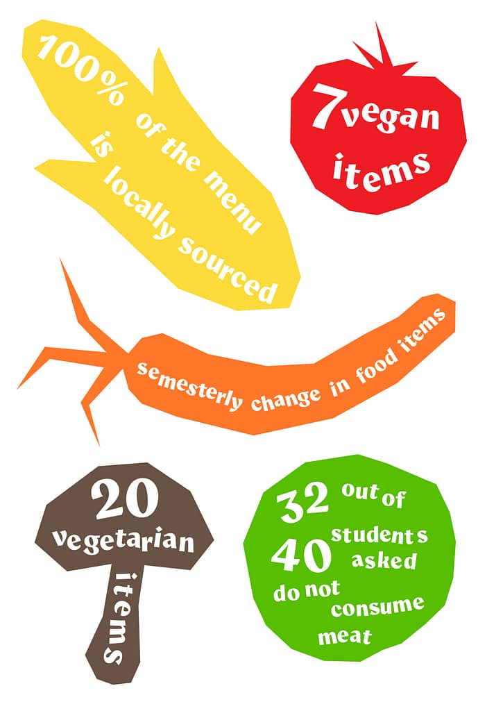 For this assignment I chose to collect data about Minerva’s majorly plant-based cafeteria. I visualized this by making the infographics in simplified shapes of certain vegetables. Then, I got the idea that these designs could be used as stickers freely given to students who support the cafeteria to further motivate them on following a vegetarian diet.