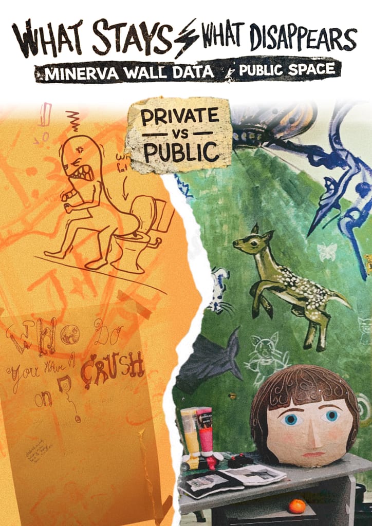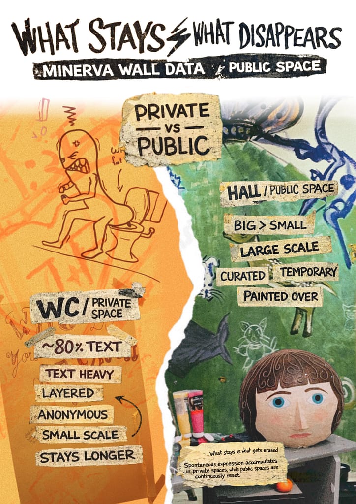 my poster shows the contrast between spontaneous, personal expression in semi-private spaces such as toilets, and the more controlled, temporary works of art in public spaces such as the hall.