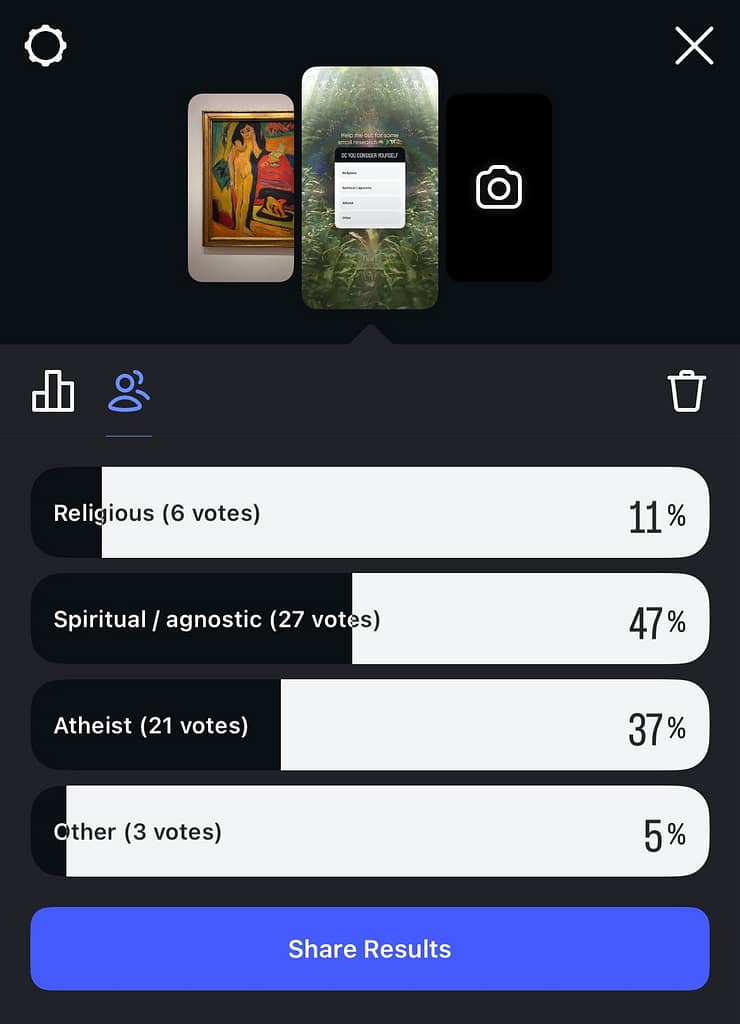 For this assignment, I wanted to visualize something that wasn’t neccessarily obvious to choose, and something that I truly find interesting and think about on a daily base. Amongst my Instagram followers, where the majority of them is around my age and a student at Minerva, I asked what level of ‘spirituality’ they identified themselves with. Everyday I start my day with thanking God for a new day. This is something small (yet big) what I always do, and it made me wonder if there are other people that might do things like this. The results of this poll I put on my Instagram story, I visualized.