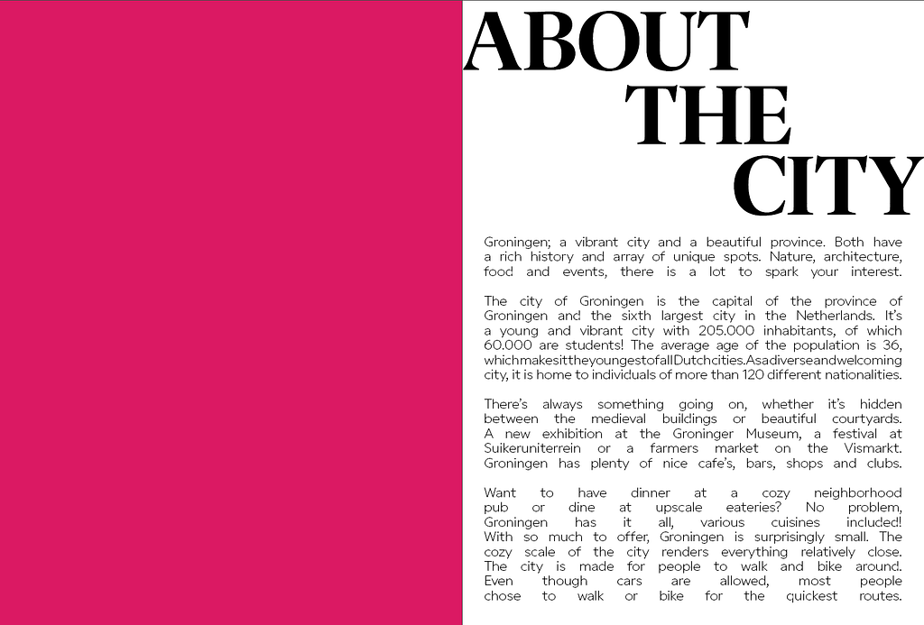 For the experimental design proporsal I want to go with really bold colors, as well as experiment with custom page cutouts throughout the magazine. My goal is not necessarily readability, I plan to focus on the aesthetics.