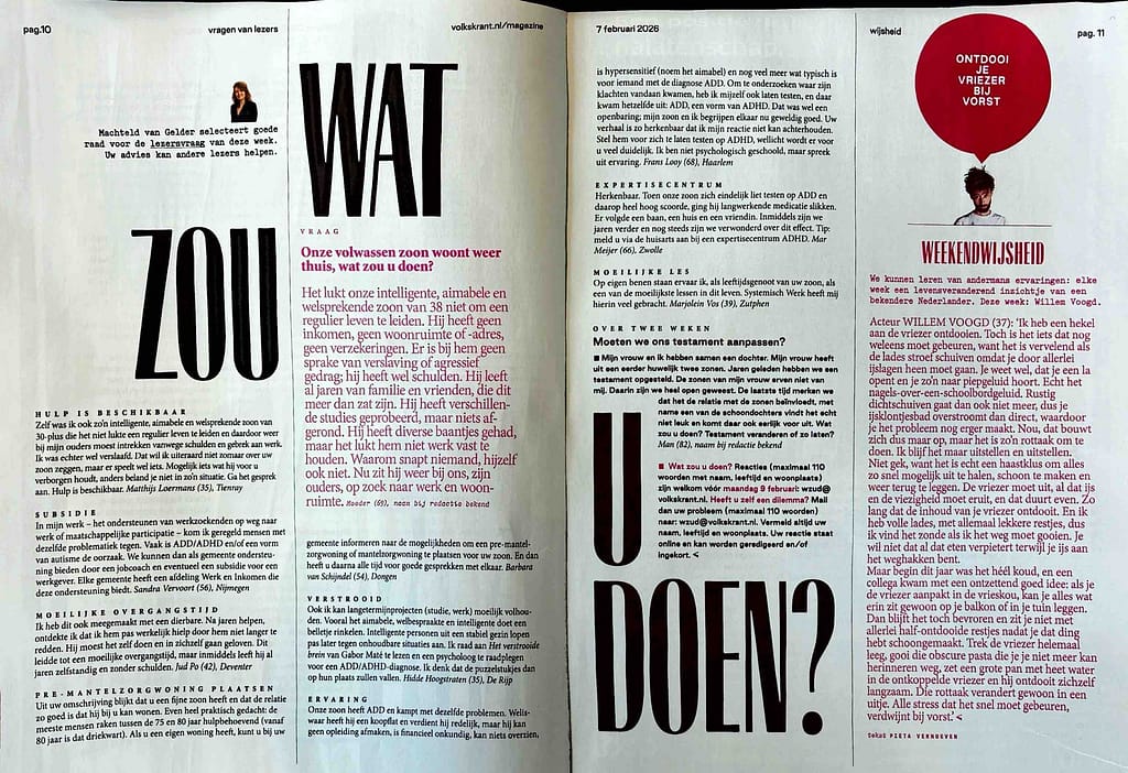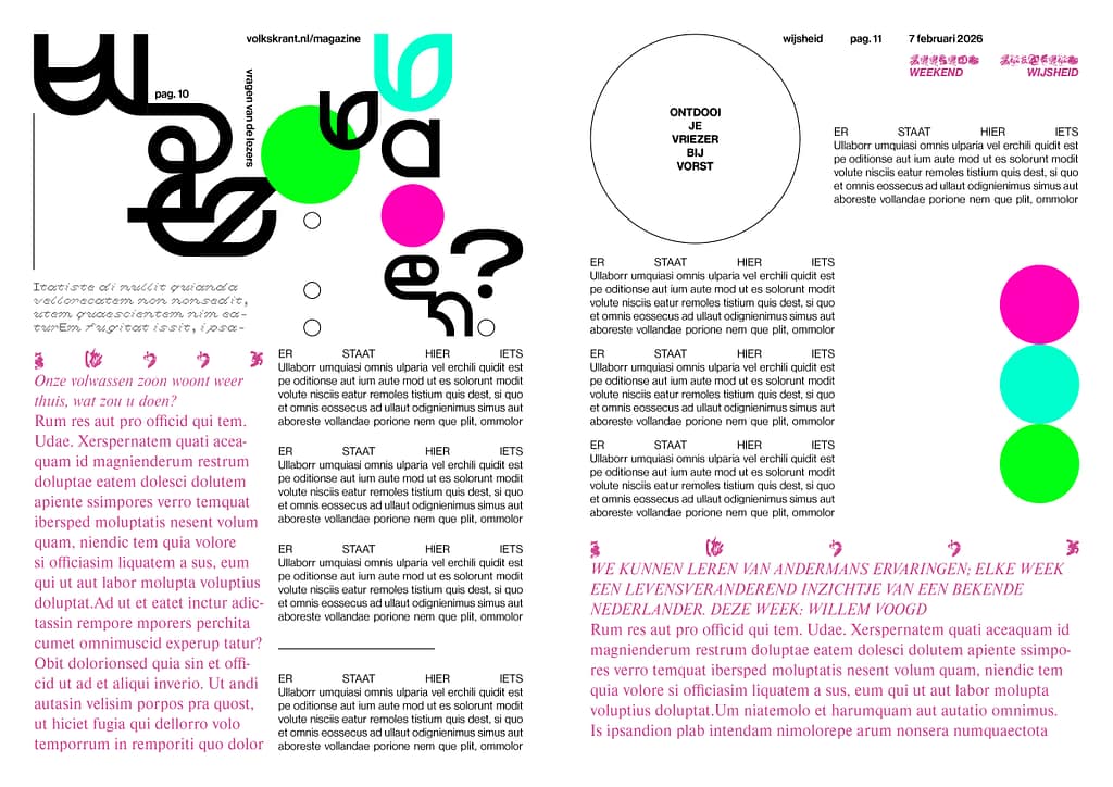 For this assignment, I wanted to give the spread a little bit more of an edge, by adding some more visually striking elements (maybe also a little bit illustrative). Also, by keeping the title on one page of the spread, I feel the divide between the two pages is more visible. I liked the hierarchy, so I chose not to diviate from that as much as possible.