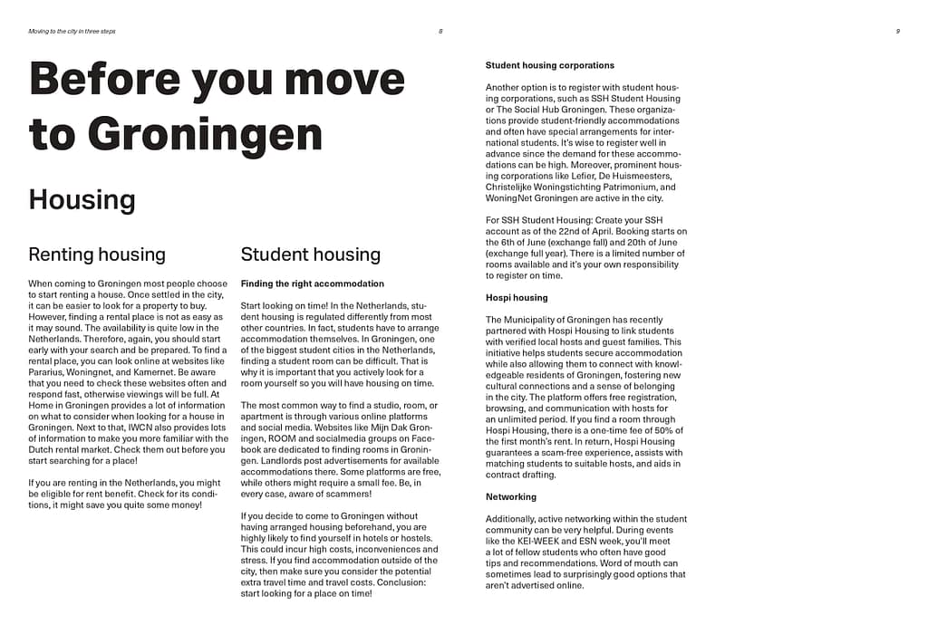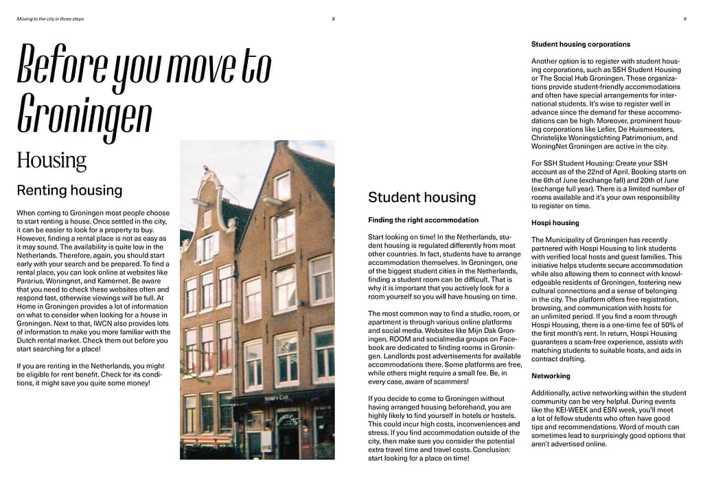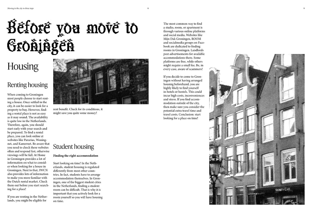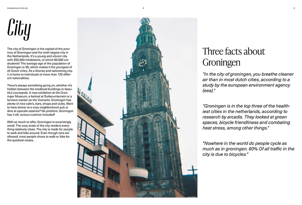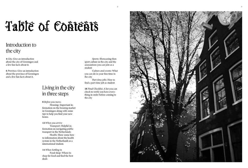 My idea is to create a magazine targeted at international students moving to Groningen. I want to create and informative piece with facts about Groningen, important information about living here, and moving, it will include tips on how to navigate life in the city and country.
