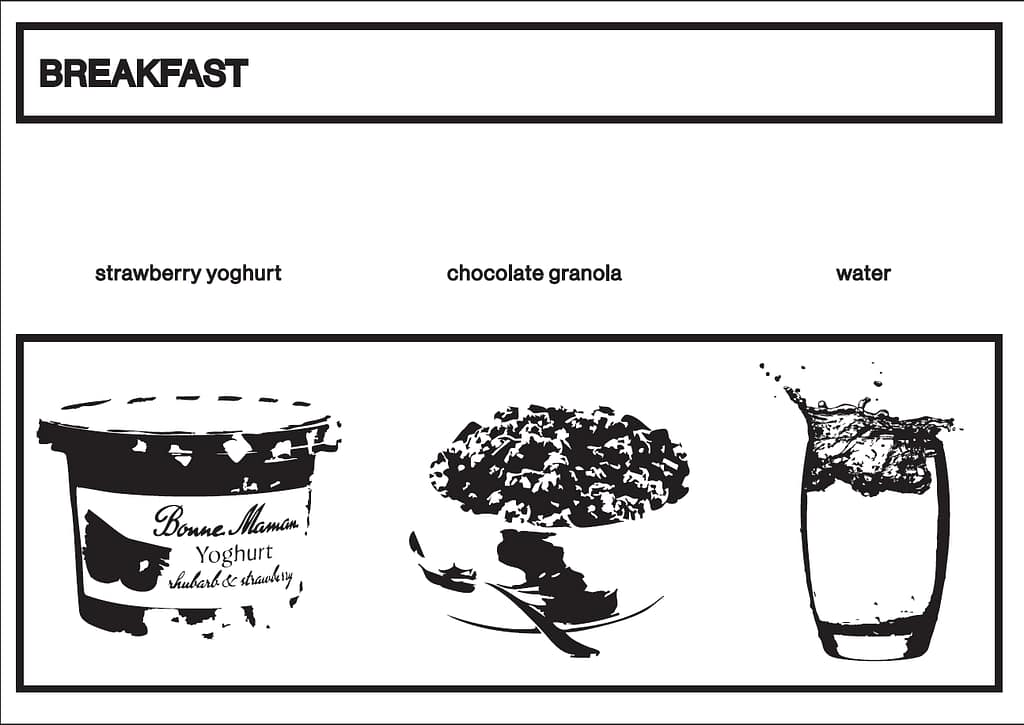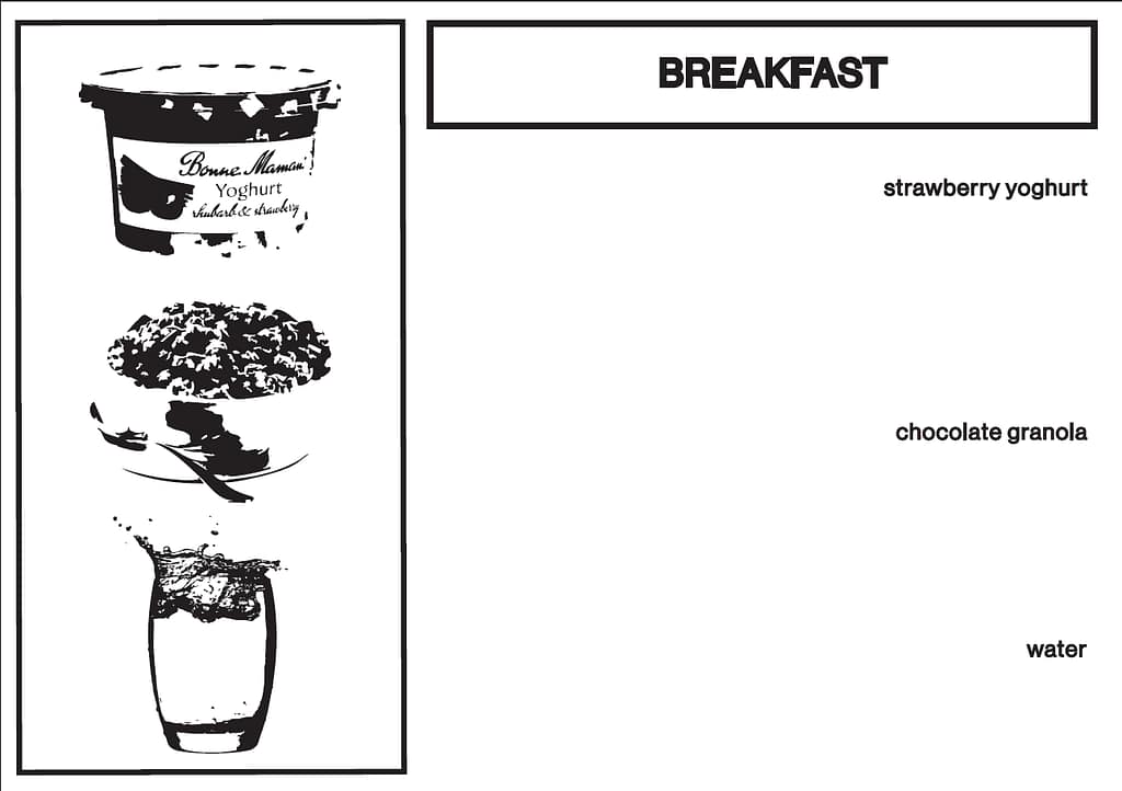 b. 250 gr strawberry yoghurt & 150 gr chocolade cruesli & 200 mL water
