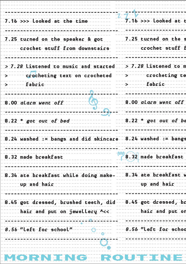 - a. 7.16 looked at the time - 7.25 turned on the speaker & got my crochet stuff from downstairs - 7.28 listened to music and started crocheting text on my crocheted fabric - 8.00 alarm went off - 8.22 got out of bed - 8.24 washed my bangs and did skincare - 8.32 made breakfast - 8.34 ate breakfast while doing make-up and hair - 8.45 got dressed, brushed teeth, did my hair and put on jewellery - 8.56 left for school - 9.01 entered classroom